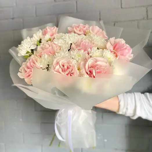 Букет выглядит воздушным и легким, создавая ощущение мягкости и свежести. Цветы идеально дополняют друг друга, придавая композиции гармонию и романтичность. Такой букет отлично подходит для особых случаев и создания трогательной атмосферы.