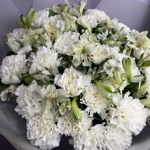 Букет сочетает в себе изящность белых гвоздик и нежность альстромерий, создавая атмосферу чистоты и свежести. Белые цветы символизируют искренность, мир и утонченность. Композиция подходит для любого случая, подчеркивая светлые и позитивные эмоции. Такой букет станет элегантным подарком, который подарит радость и тепло.
