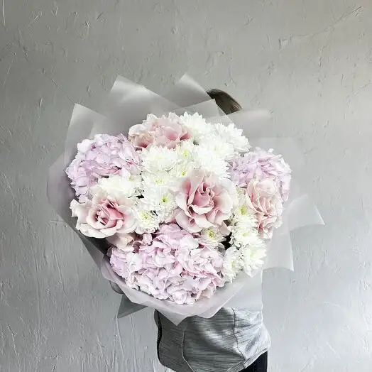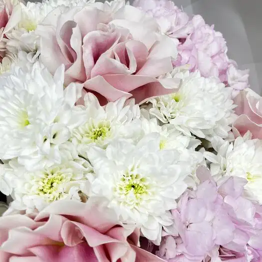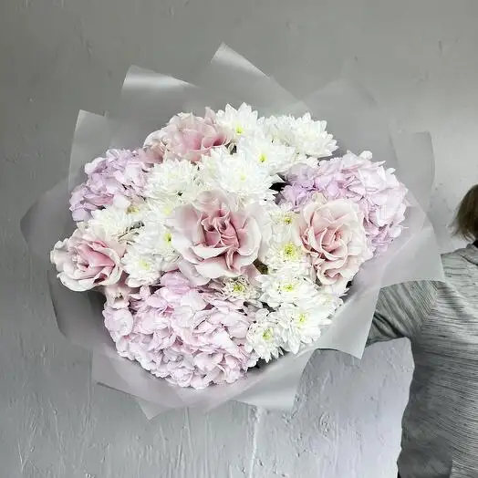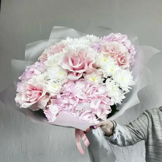 В букете нежно переплетаются розовые гортензии с изысканными французскими розами светло-розового оттенка. Белые пушистые хризантемы добавляют объём и воздушность композиции. Цветы гармонично сочетаются, создавая романтичный и изящный образ. Этот букет идеально подходит для особого случая или в подарок, выражая теплоту и заботу.