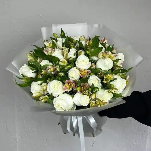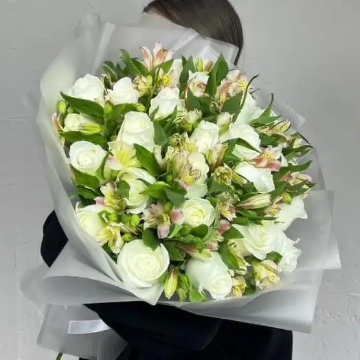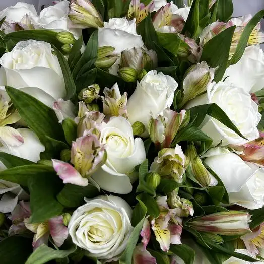 В букете сочетается нежная пастель розовых альстромерий с чистотой и элегантностью белых роз. Такая композиция вызывает чувство спокойствия и умиротворения, идеально подходит для особых случаев и выражения искренних чувств. Альстромерии добавляют текстуру и живость, создавая гармоничный контраст с изяществом роз. В целом, букет выглядит свежо, лёгко и очень женственно