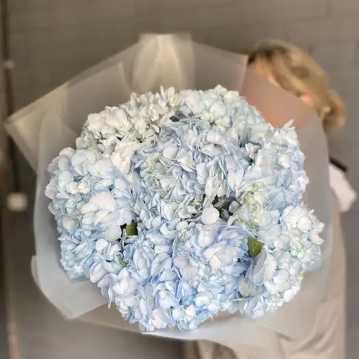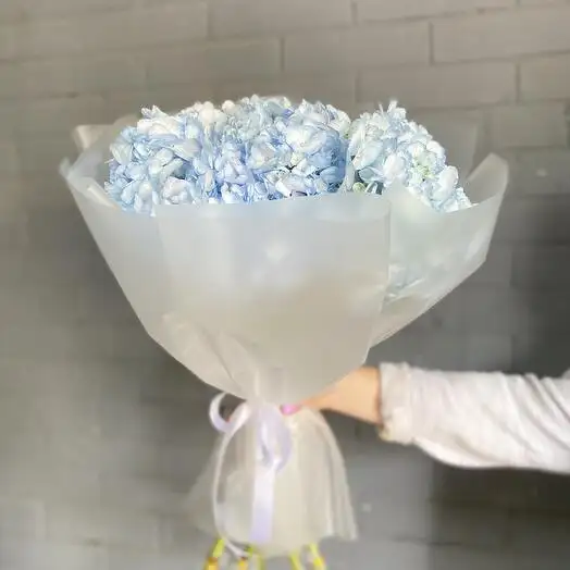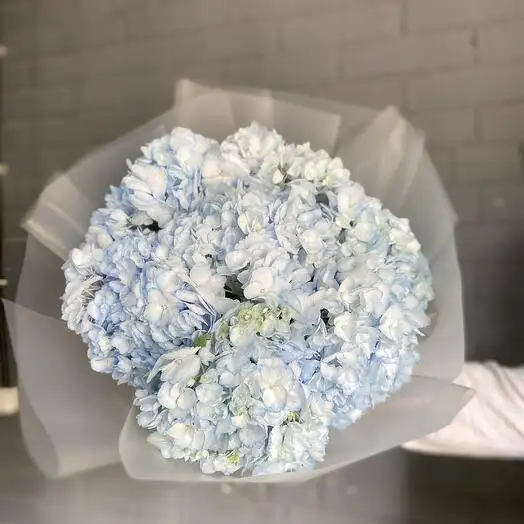 Этот нежный букет из голубых гортензий создаёт атмосферу лёгкости и свежести. Яркий цвет дарит ощущение спокойствия и умиротворения в любом интерьере.