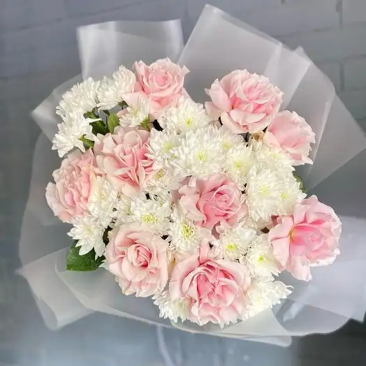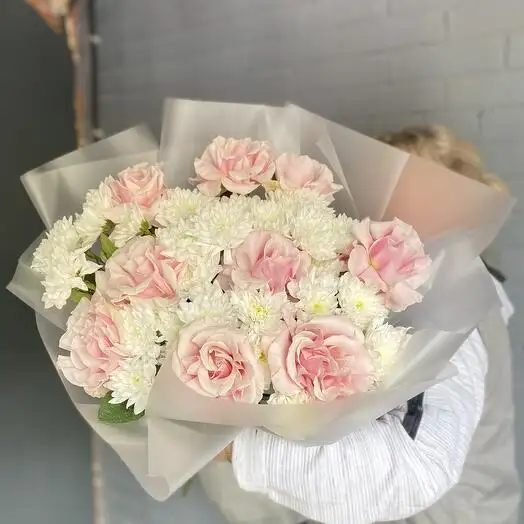 Букет выглядит воздушным и легким, создавая ощущение мягкости и свежести. Цветы идеально дополняют друг друга, придавая композиции гармонию и романтичность. Такой букет отлично подходит для особых случаев и создания трогательной атмосферы.