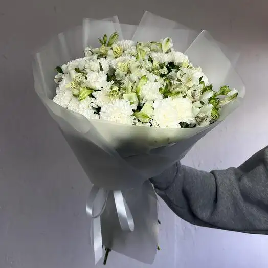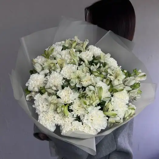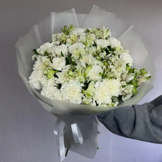 Букет сочетает в себе изящность белых гвоздик и нежность альстромерий, создавая атмосферу чистоты и свежести. Белые цветы символизируют искренность, мир и утонченность. Композиция подходит для любого случая, подчеркивая светлые и позитивные эмоции. Такой букет станет элегантным подарком, который подарит радость и тепло.