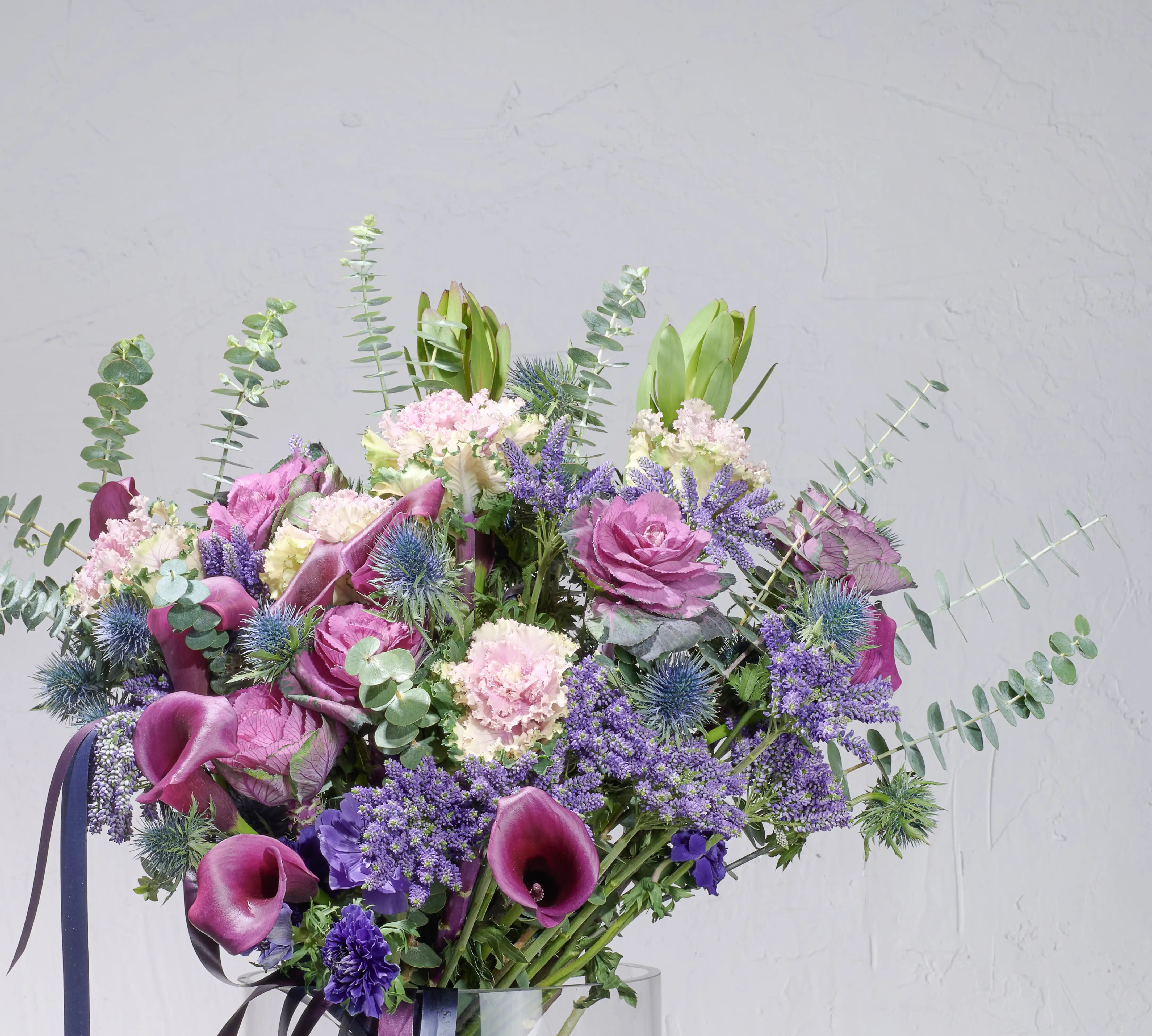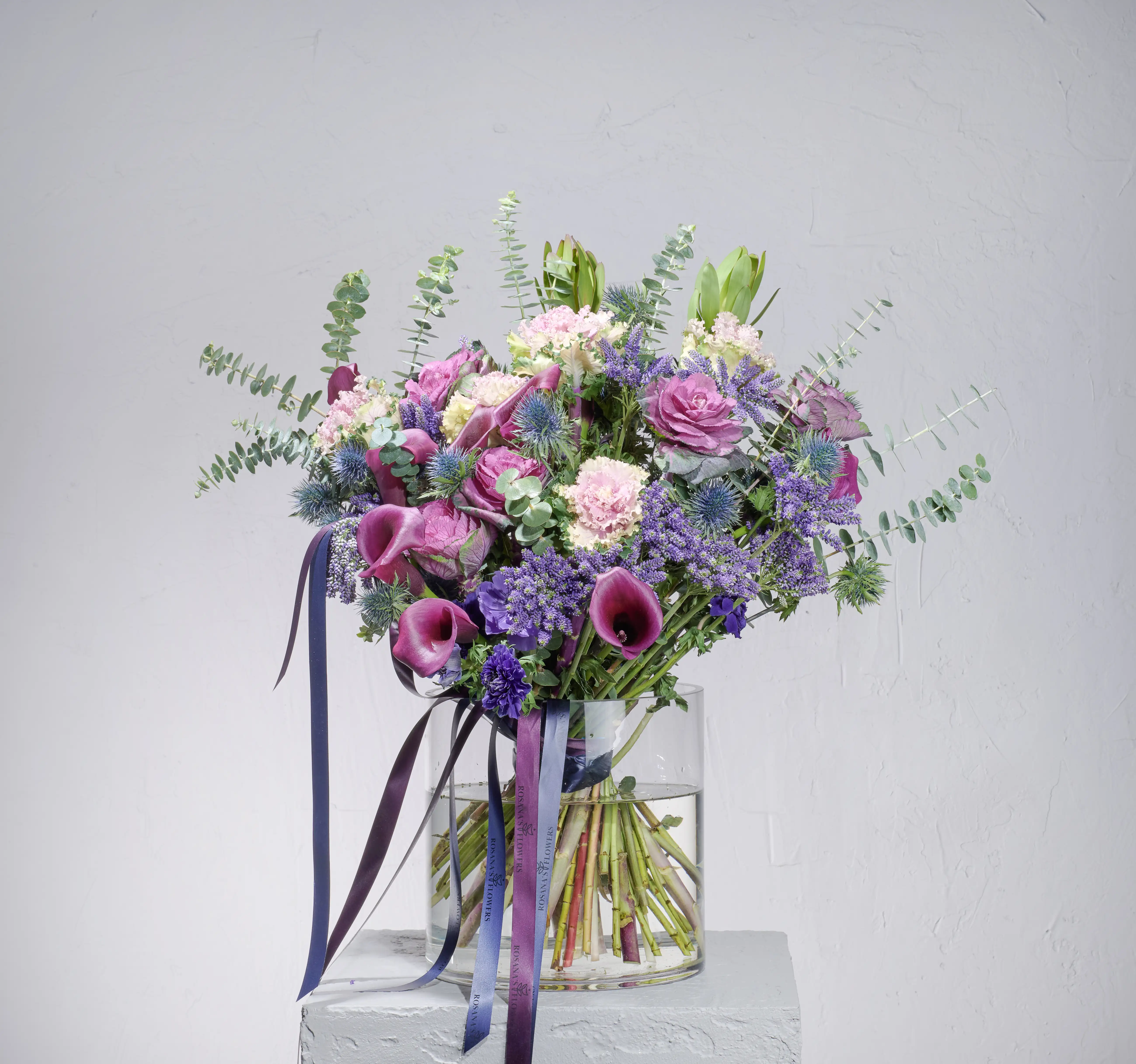 Этот изысканный букет словно соткан из вечерней прохлады и тонких ароматов лета. Лавандовые, сиреневые и пыльно-розовые оттенки переплетаются в гармоничной симфонии, создавая ощущение уюта, романтики и лёгкой мечтательности. Идеален для утончённого признания, знака внимания или как акцент в интерьере с характером. Дополняют композицию струящиеся атласные ленты цвета ночного неба.