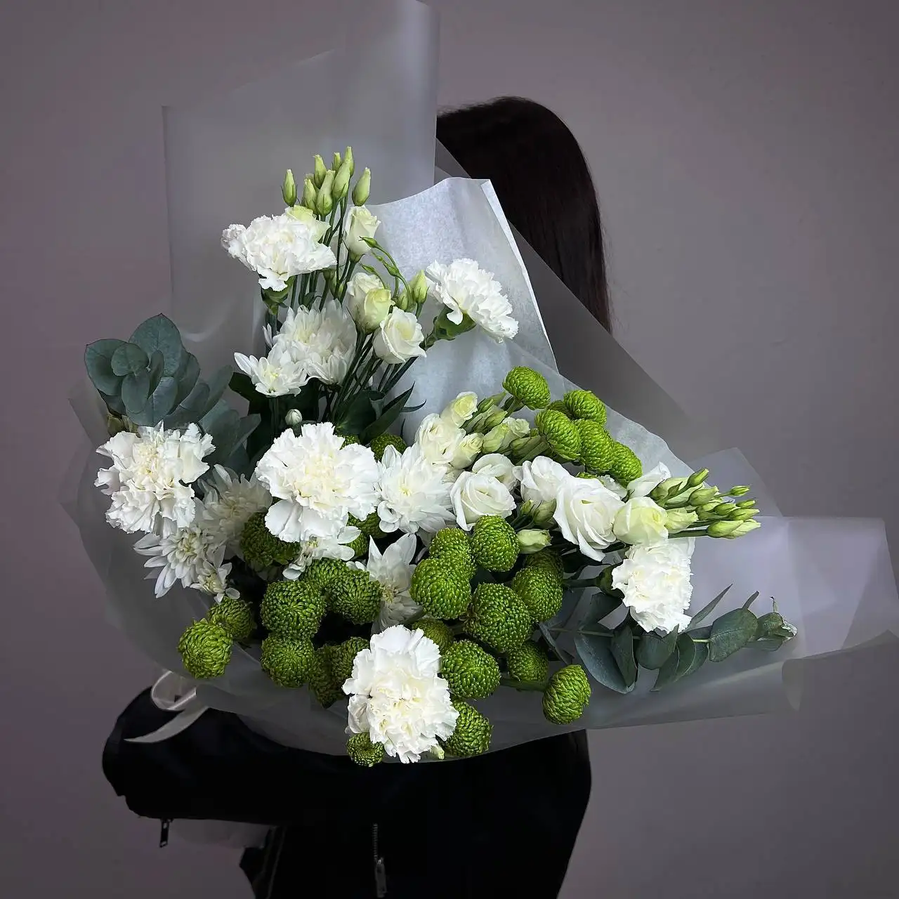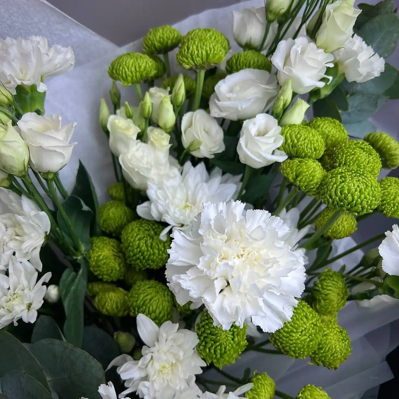 Этот букет сочетает в себе нежность и свежесть благодаря эустомам и хризантемам. Гвоздики придают композиции выразительность и насыщенность цвета. Сантини добавляют яркости и объемности, создавая живую и жизнерадостную атмосферу. Эвкалипт завершает букет легкой зеленью и ароматом, делая его образ законченным и гармоничным.