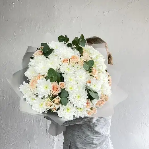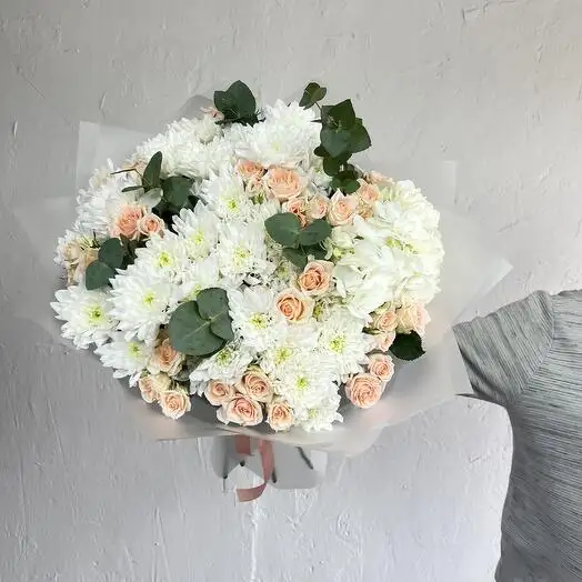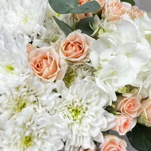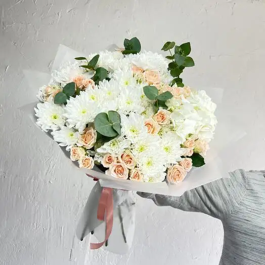 Этот букет сочетает в себе пушистую белизну хризантем и нежность гортензии, создавая воздушную и светлую композицию. Кустовые розы Ариони добавляют яркость и изящество, подчёркивая утончённый характер букета. Ветки эвкалипта вносят свежесть и лёгкую зелёную нотку, придавая объёма и глубины. В целом, букет выглядит гармонично, элегантно и свежо, подходя для любого торжественного случая.